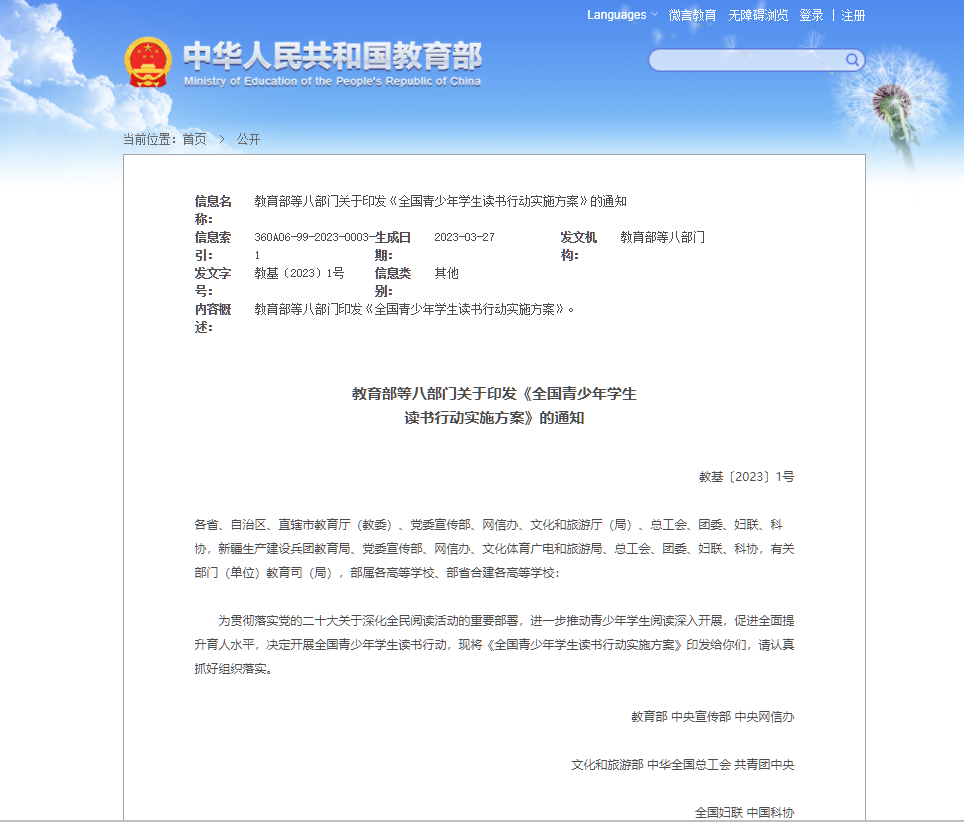 2023年3月,教育部官方發(fā)布《教育部等八部門關(guān)于印發(fā)<全國青少年學生讀書行動實施方案>的通知》,其中具體實施中明確表示“倡導廣泛全面閱讀”,并對中小學、大學階段閱讀類目進行明確......